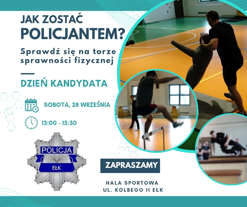 Komenda Powiatowa Policji w Ełku zaprasza wszystkich chętnych na "Dzień Kandydata" w dniu 28.09.2024r. w godz. 13:00-15:30. Uczestnicy będą mieli możliwość sprawdzenia swoich umiejętności na torze sprawności fizycznej (tor przeszkód), który jest jednym z elementów rekrutacji do policji. Wstęp wolny (nie są wymagane wcześniejsze zapisy).